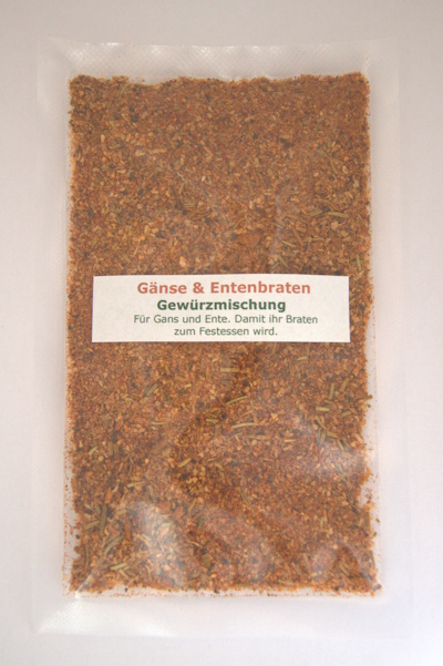 Die Gans oder Ente innen und außen gut abwaschen, trocken tupfen und mit der Gewürzmischung einreiben. Wer mag kann zusätzlich etwas Honig oder Orangensaft bestreichen, um eine schöne Glasur zu bekommen. Beim Braten regelmäßig mit dem austretenden Fett übergießen.