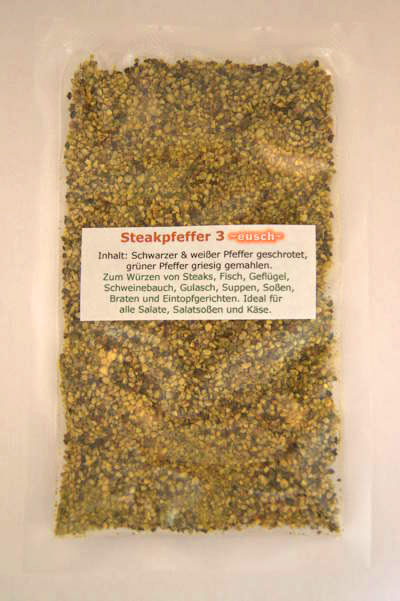 Zutaten: Schwarzer & Weißer Pfeffer geschrotet, Grüner Pfeffer griesig gemahlen.